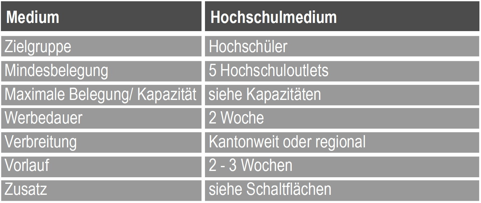 Es können Flyer, Prospekte und Produktproben an Hochschulen zur über uns an die Hochschüler bestimmter Hochschulstandorte oder Fachrichtungen verteilt werden. Die Verteilung vor Ort erfolgt mit Zustimmung der Hochschule und meist über Studenten vor Ort.